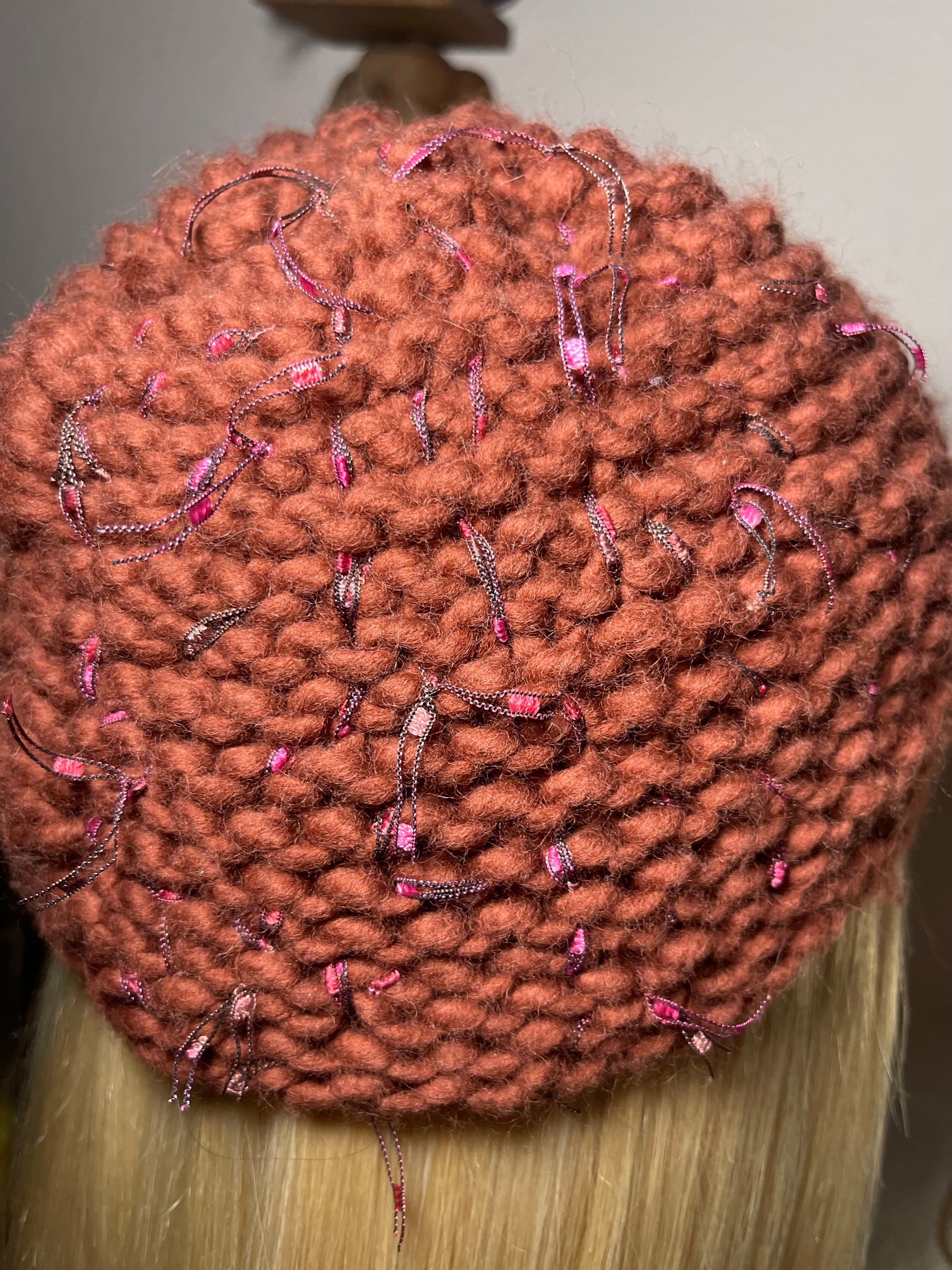 This fitted skullcap is made out of a thick wool that's named "henna" given it's burnt orange tone! I combined this wool with a bohemian thread that has two-toned little pink squares sewn into it. Handmade by yours truly. I figured the hot pink would go fabulously with the warm copper color! Please note: as this isn't constructed like a regular beanie it doesn't fit like one. The fit is quite snug and ideal for a 21-23" head as there is some stretch to it!