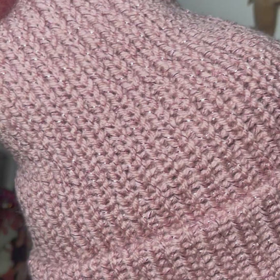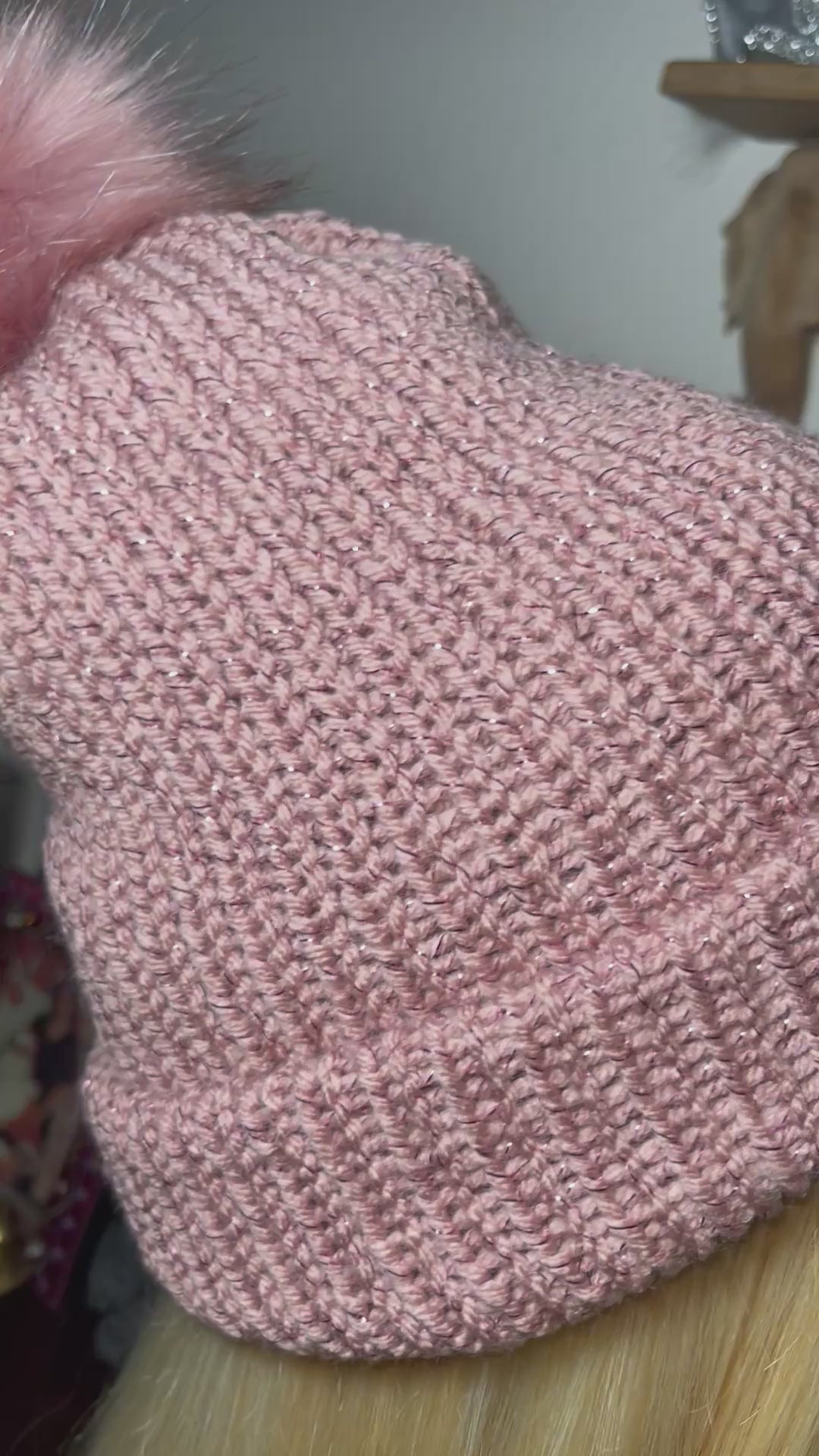 "Dusty Rose" Sparkly Cuffed Beanie W/ Puffball