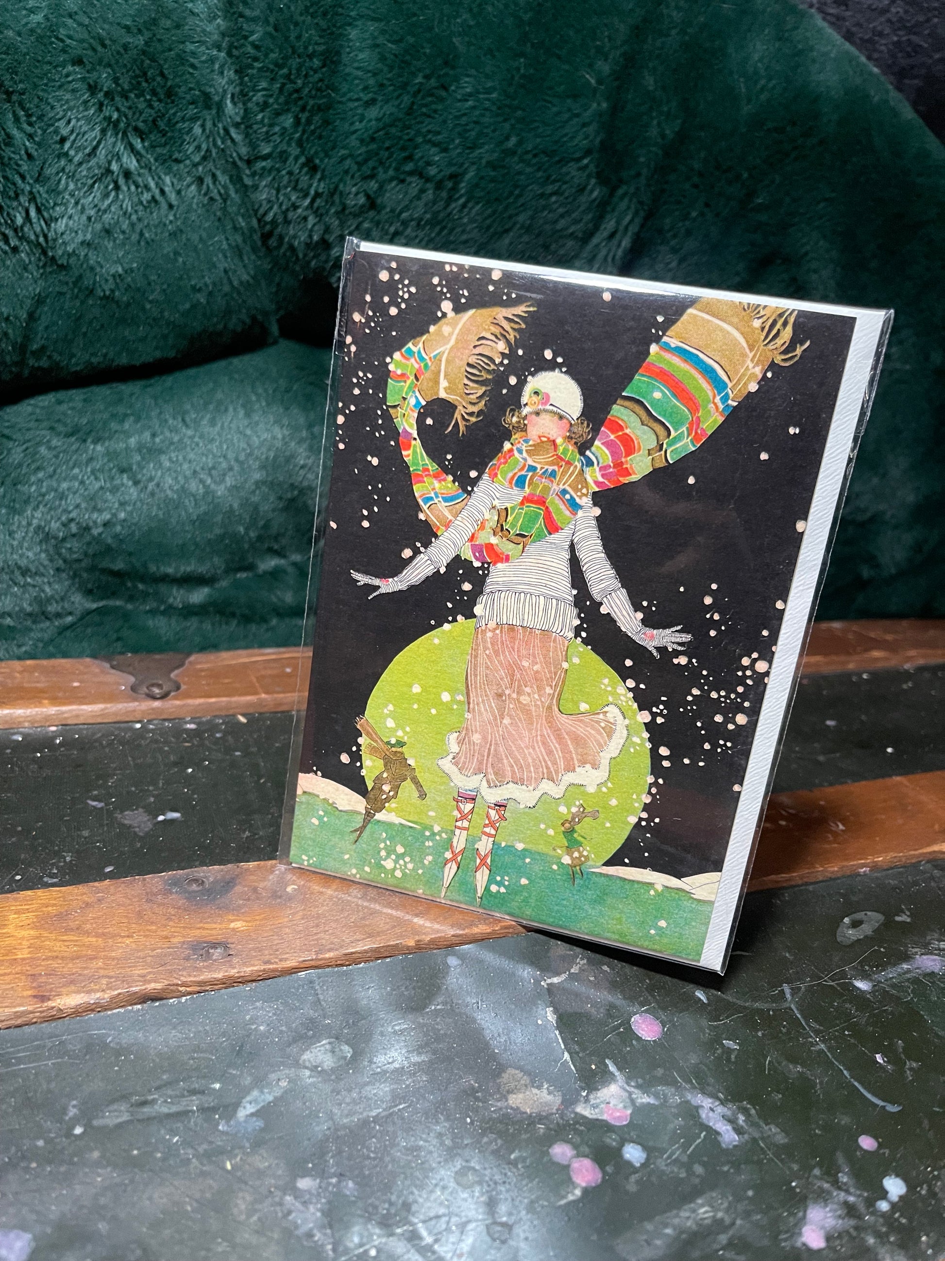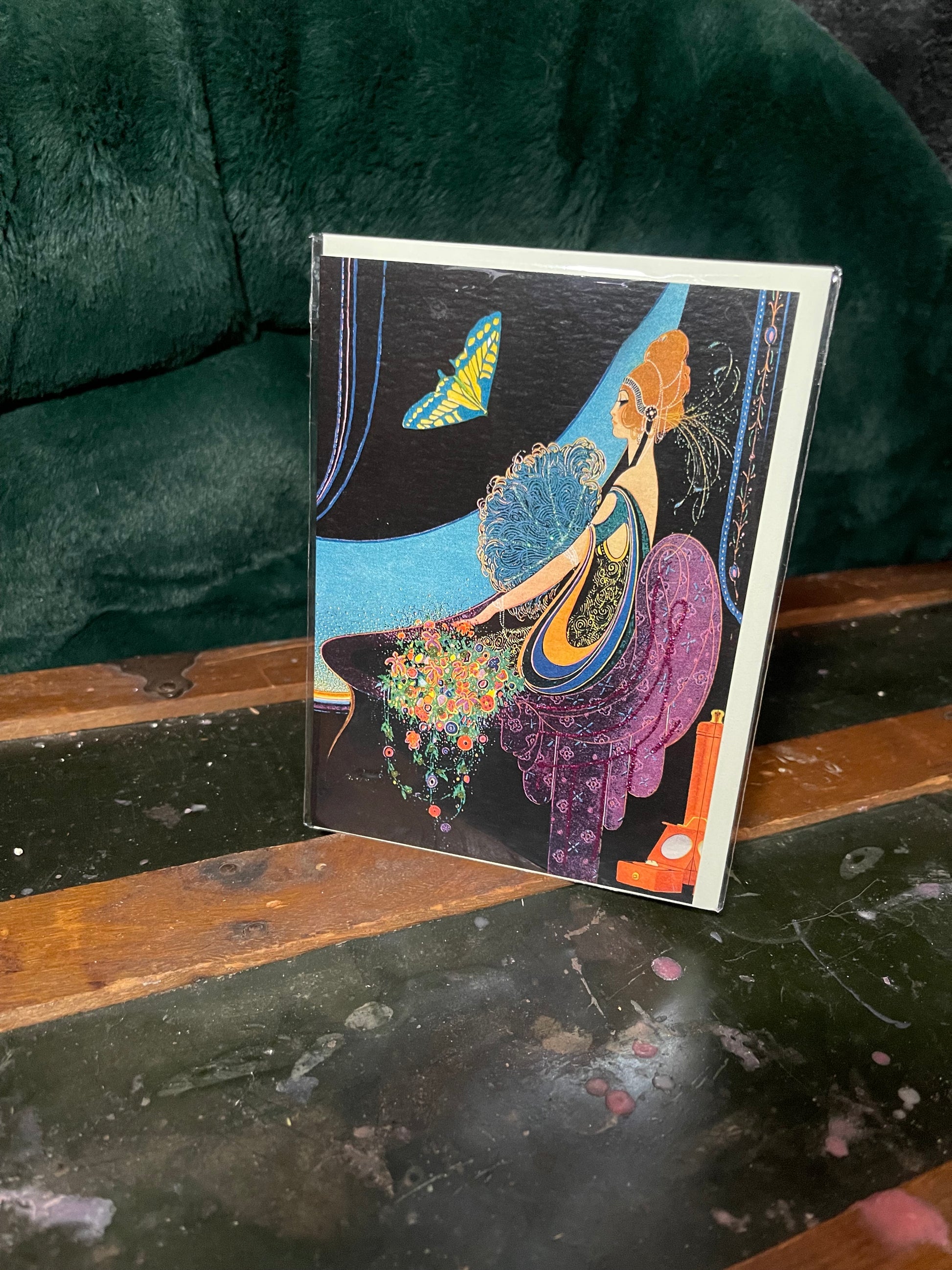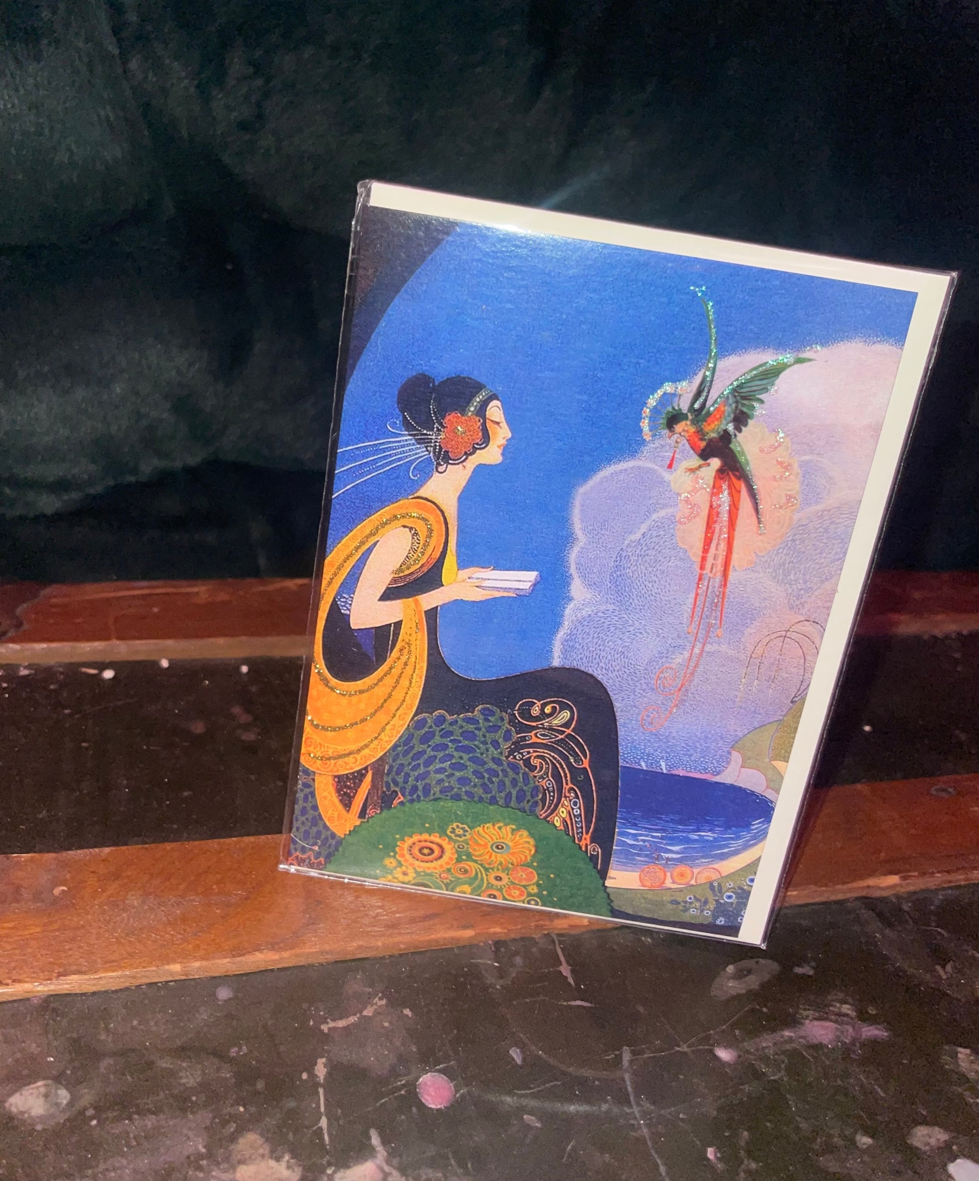 Send a message in style! These lovely art pieces feature two different beautiful styles. Depicting two gorgeous women in full feather alongside their parrot companions. These cards come equipped with embedded glitter, so it's sure to stay in place!