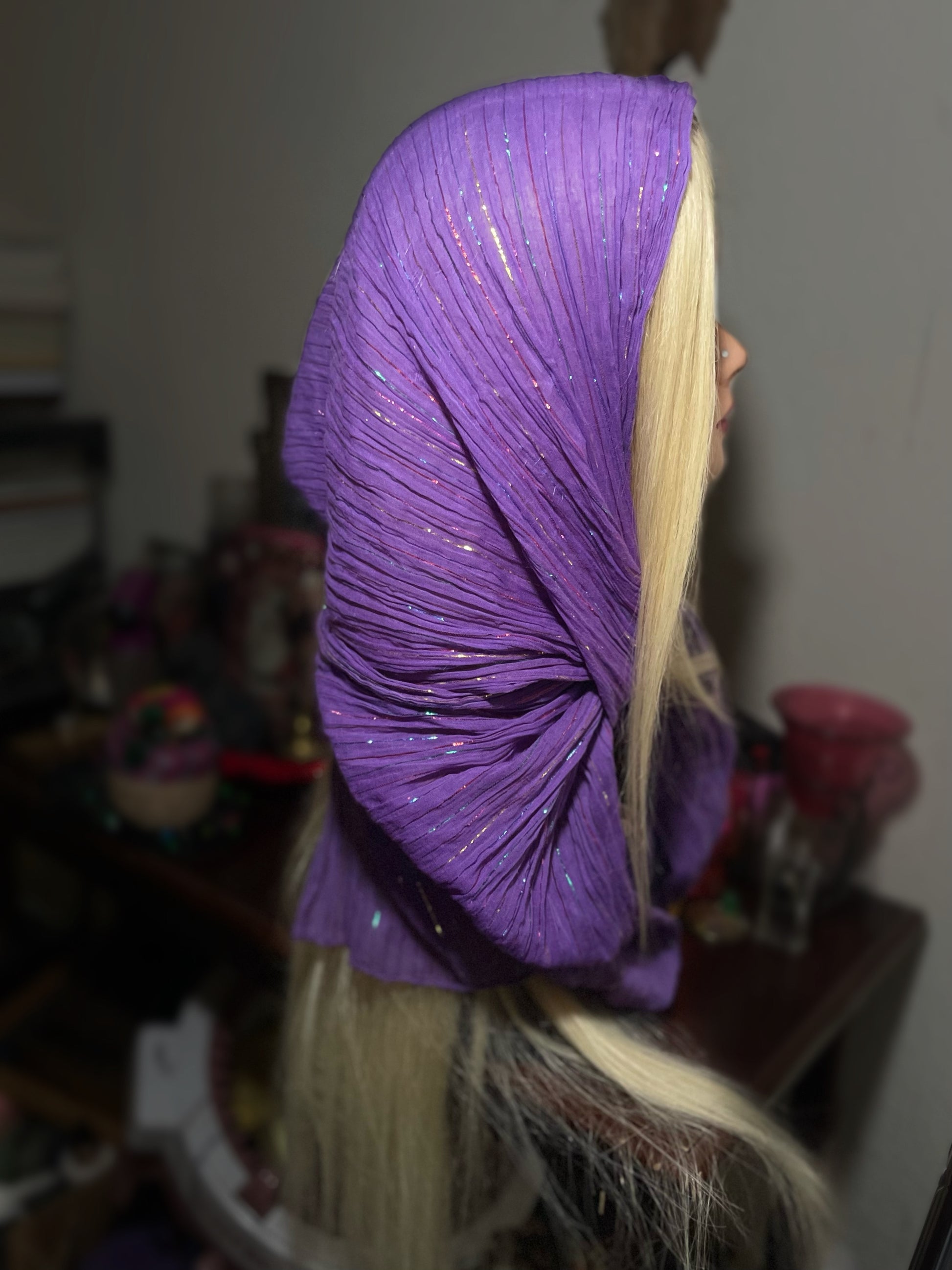 I must say, the pictures of this scarf, absolutely do not do it justice! It is just so gorgeous the way the light hits the multicolored metallic stripes. This is, without a doubt, a flashy bohemian clothing piece. A MUST HAVE!! I believe this scarf is chiffon as well! In the daylight, the noticeable sparkly stripes glisten and reflect in the sun! This is another scarf drapes so beautifully on the body or in the hair!